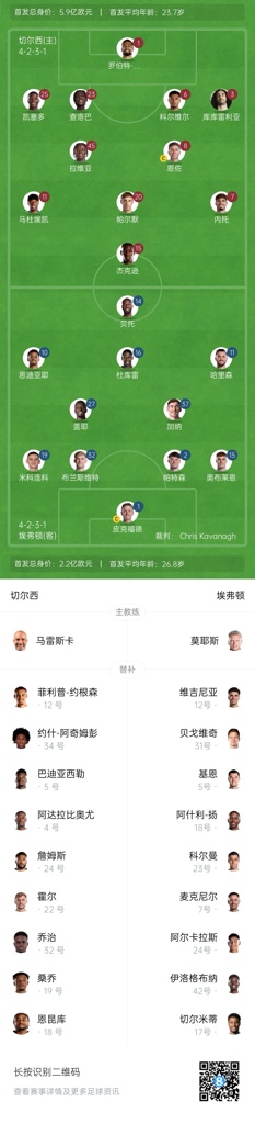 切尔西首发:1-罗伯特-桑切斯、3-库库雷利亚、6-科尔维尔、23-查洛巴、8-恩佐、20-帕尔默、25-凯塞多、45-拉维亚、7-佩德罗-内托、11-马杜埃凯、15-杰克逊