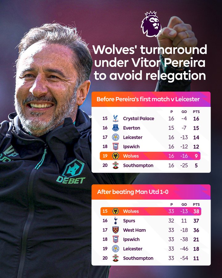 2024年12月,狼队宣布由佩雷拉接管狼队主帅的位置。佩雷拉上任后,带队取得11胜2平7负的成绩,狼队从落后保级区5分到如今领先17分提前完成保级,实现了惊人的逆袭。